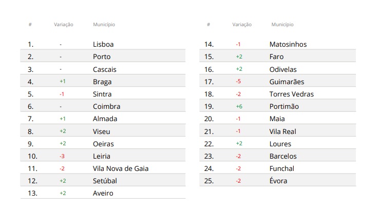 Uma prestação muito positiva dos dois municípios algarvios presentes neste Top 25. Destaca-se a subida de Braga ao 4º lugar, ultrapassando Sintra e ficando apenas atrás de Lisboa, Porto e Cascais graças a uma excelente prestação nas três variáveis em análise e a reentrada de Oeiras no Top 10.